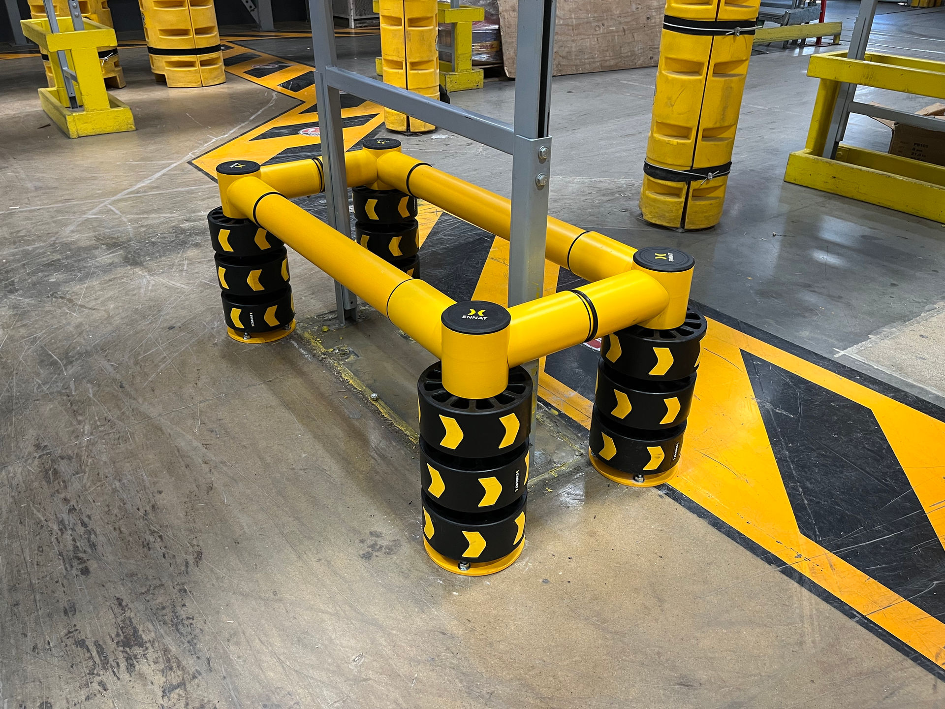 Diseñada para proteger pilares y columnas estructurales expuestas a impactos de alta energía. Su estructura modular permite configuraciones personalizadas, combinando la resistencia del acero con la flexibilidad y absorción del caucho.